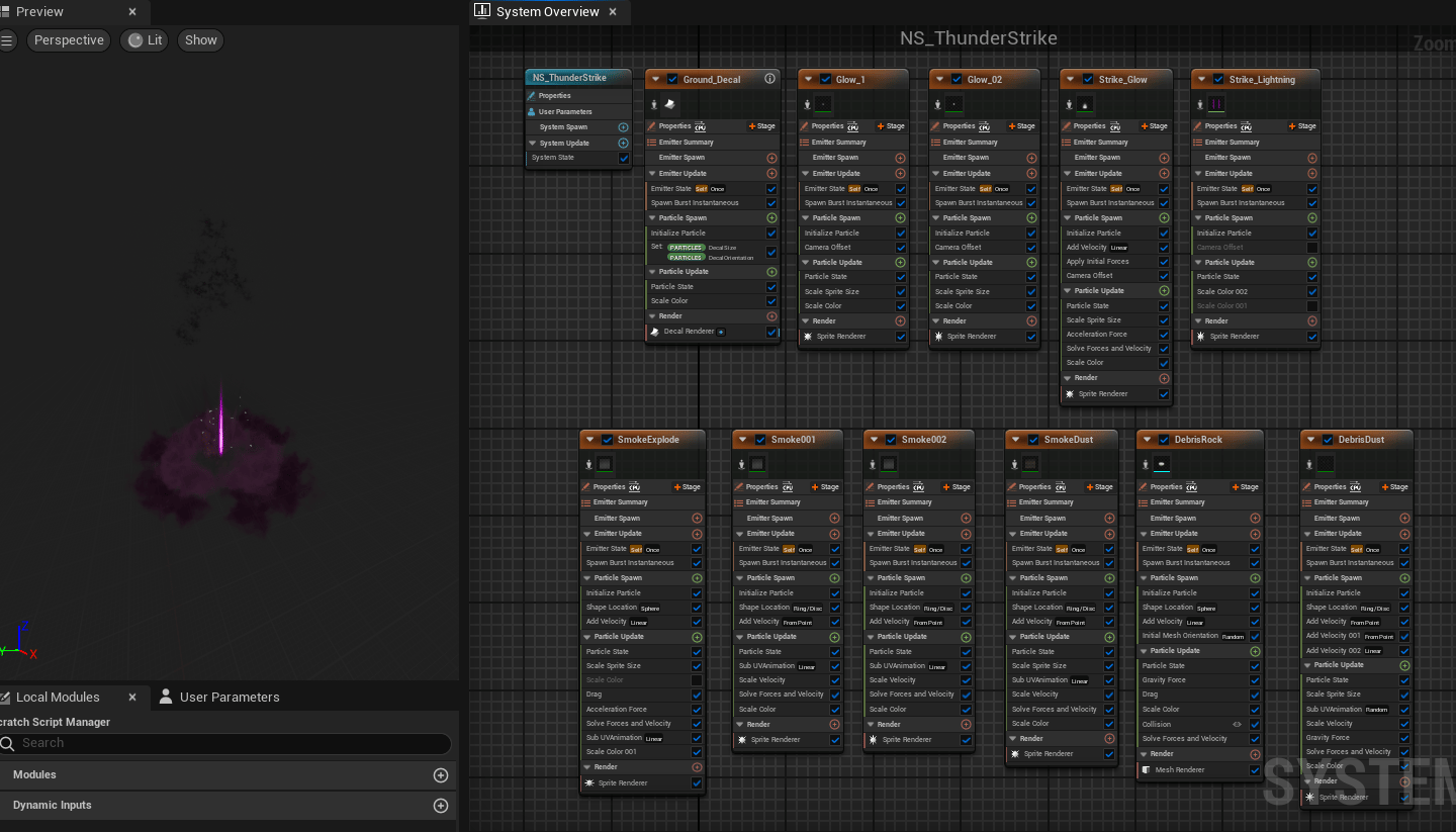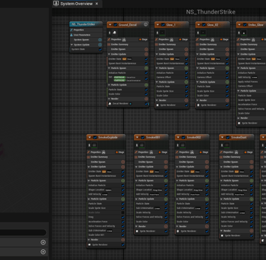 All emitter design, timing logic, sequencing, curve animation, particle behavior, color direction, and overall effect composition were independently created and assembled. The multi-layered system includes glow bursts, lightning strikes, smoke stages, and debris emitters to achieve a polished, cohesive impact effect.