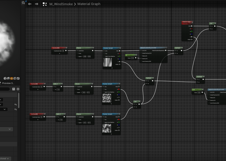 A Fresnel-based smoke material that creates soft, animated edge glow and natural motion behind the projectile. The base texture used in these materials is sourced from the Paragon: Serath character pack by Epic Games.